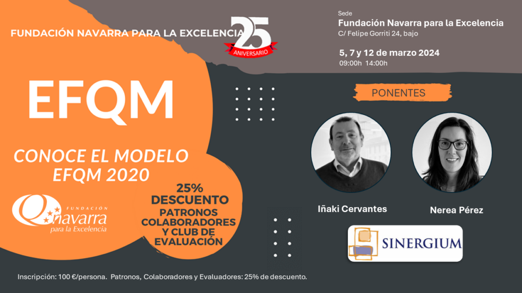 AVISO: ESTE CURSO PROGRAMADO PARA EL PRÓXIMO 5 DE MARZO, QUEDA APLAZADO HASTA FIJAR NUEVAS FECHAS. AQUELLAS PERSONAS INTERESADAS QUE SE INSCRIBAN AL CURSO, SERÁN INFORMADAS DE MANERA PRIORITARIA CUANDO SE MARQUEN LAS NUEVAS FECHAS. CONOCE EL MODELO EFQM2020 La...