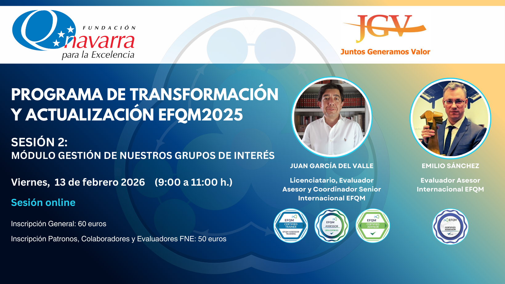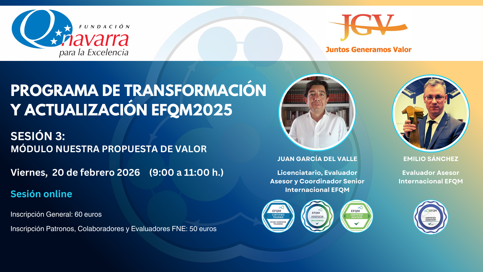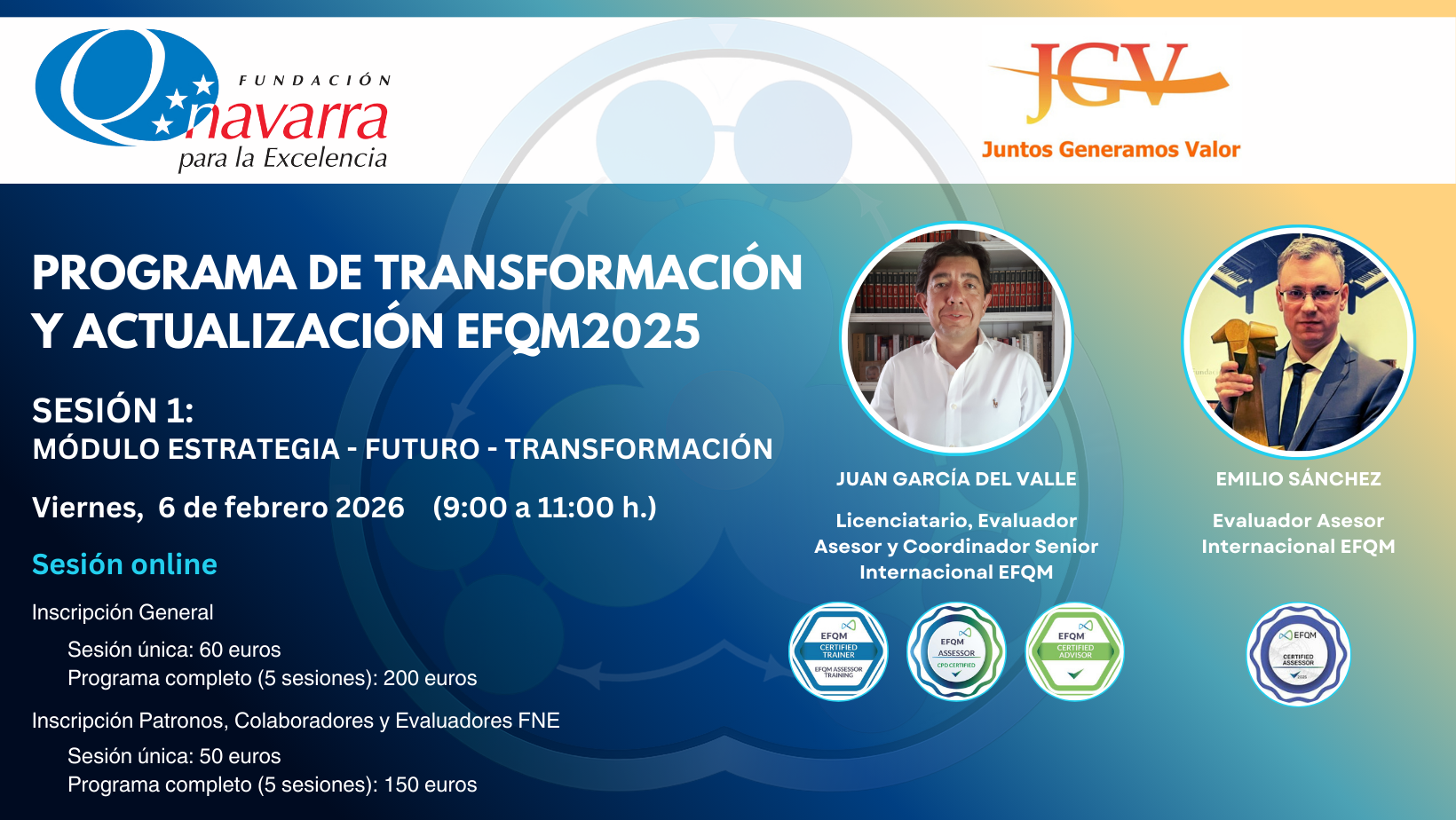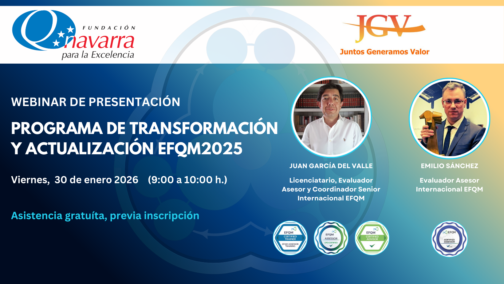 WEBINAR GRATUITO PRESENTACIÓN DEL PROGRAMA DE TRANSFORMACIÓN Y ACTUALIZACIÓN EFQM2025 Este programa formativo y de acompañamiento, íntegramente online, está diseñado para resolver la incertidumbre del cambio mediante la utilización de herramientas prácticas, facilitando el paso de la teoría a la...